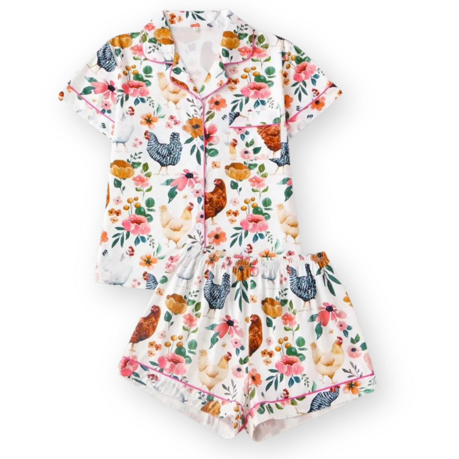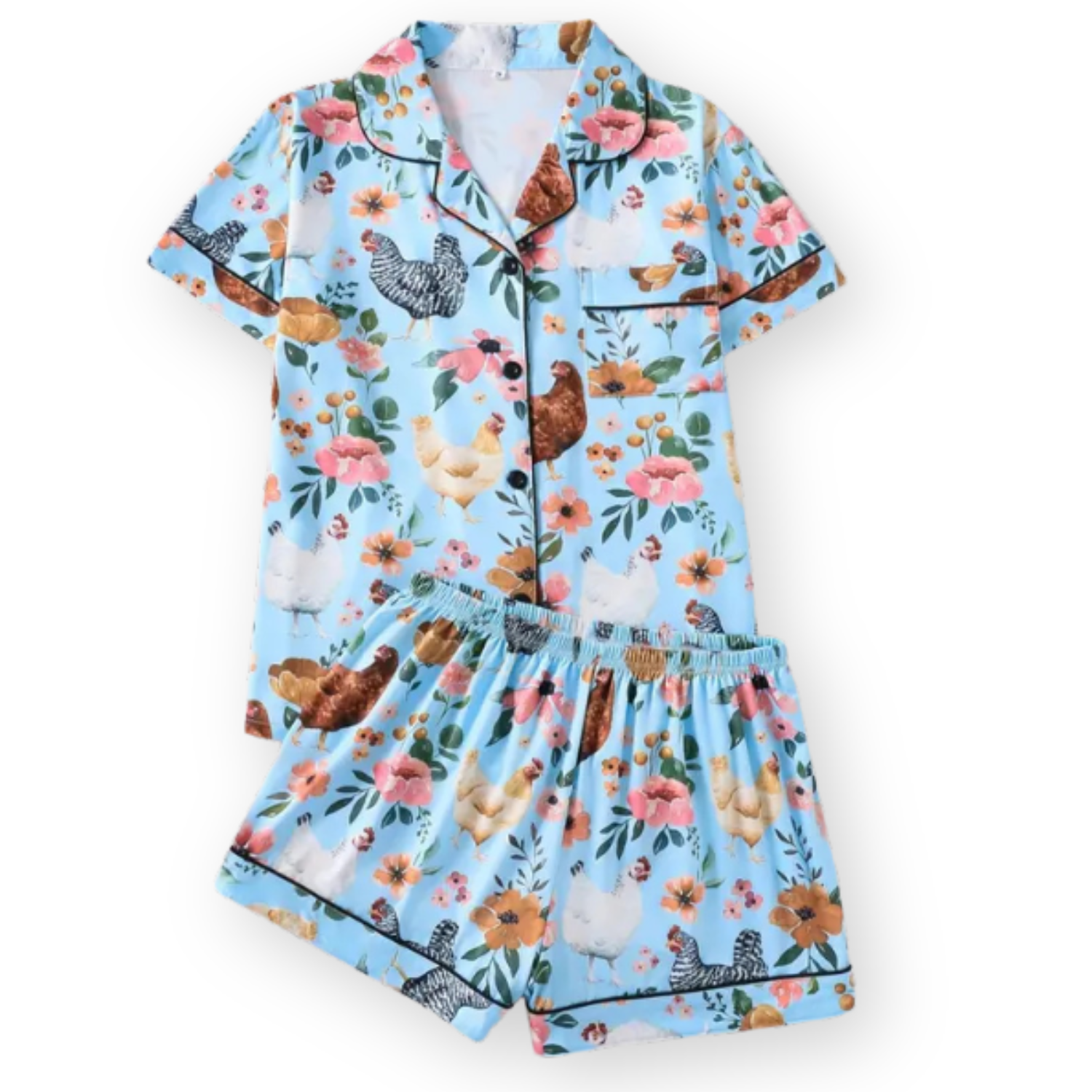 These ultra-soft floral chicken pajamas combine buttery comfort with a charming hen print — perfect for relaxing, gifting, or showing off your farm-loving personality. Whether you're lounging at home or buying for a chicken-obsessed friend, this novelty pajama set is the cozy upgrade everyone deserves.
